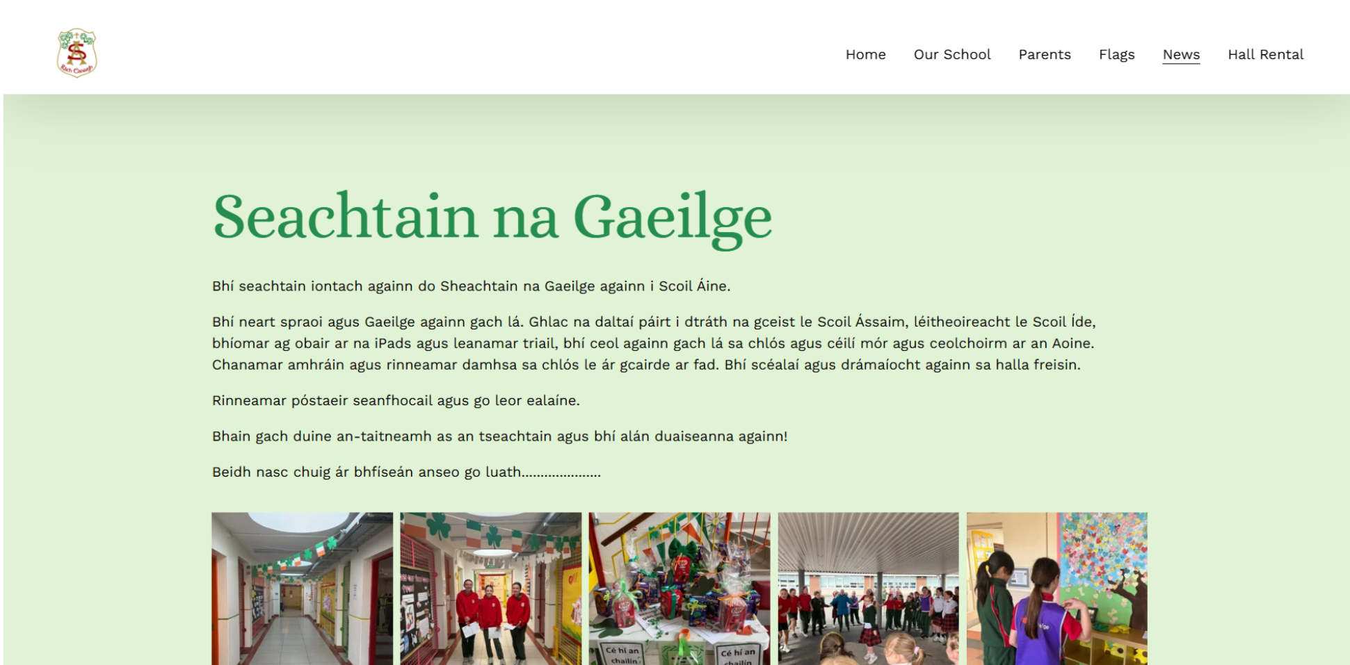 Is scoil Ghaelbhratach muid agus tá grá againn don Ghaeilge. Bíonn Lá Ghaeilge againn gach Céadaoin, agus labhraímid Gaeilge i rith an lae. Labhraímid Gaeilge sa seomra ranga, sa chlós agus timpeall na scoile. Bíonn gach duine páirteach ann.